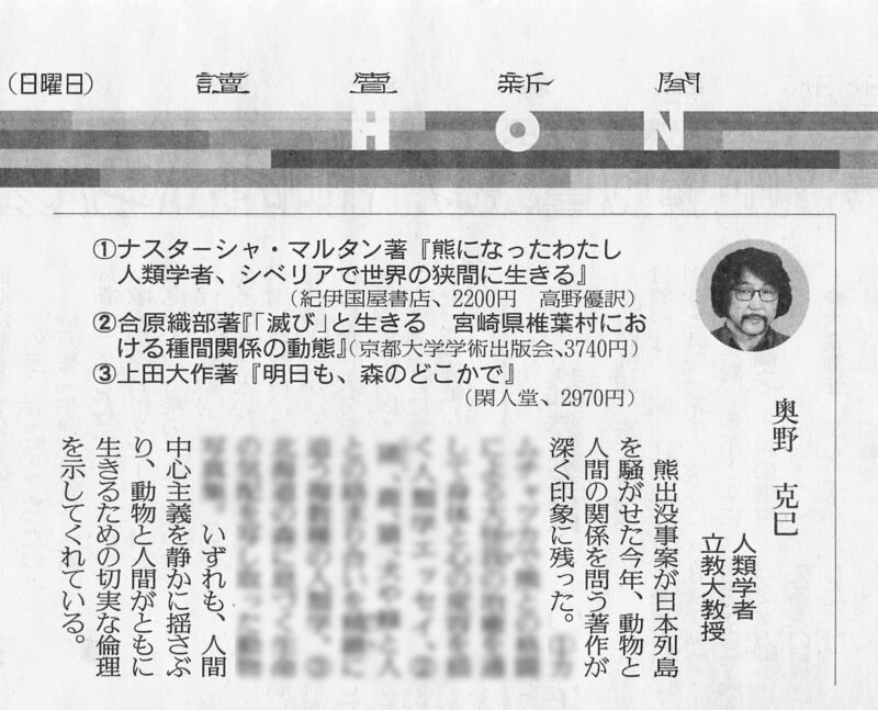 読売新聞「2025年の3冊」に『明日も、森のどこかで』 2025 12/29 メディア掲載 明日も、森のどこかで 2025年12月29日 読売新聞の読書面「本よみうり堂」の年末企画「読書委員が選ぶ2025年の3冊」で、人類学者・奥野克巳さんの3冊に上田大作『明日も、森のどこかで』を取り上げていただきました。先月の書評に続き、ありがとうございます。 読売新聞 2025年12月28日朝刊 関連書籍 明日も、森のどこかで 上田大作 閑人堂 詳細 Amazonで購入 楽天ブックスで購入 メディア掲載 明日も、森のどこかで